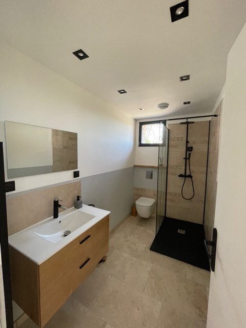 - Salle de bains avec douche à l’italienne, WC, sèche serviette, sèche-cheveux, etc. Meuble vasque avec rangements.